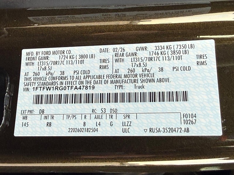 - VIN : 1FTFW1RG0TFA47819